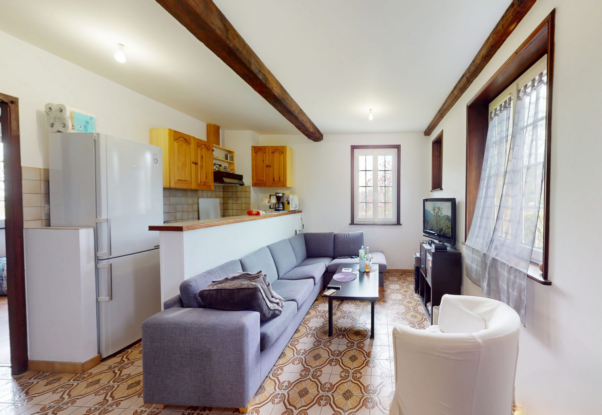 - d'un troisième logement (loué) en rez de chaussée dans la partie Sud, comprenant : entrée, séjour/cuisine, dégagement, chambre, salle d'eau et WC.