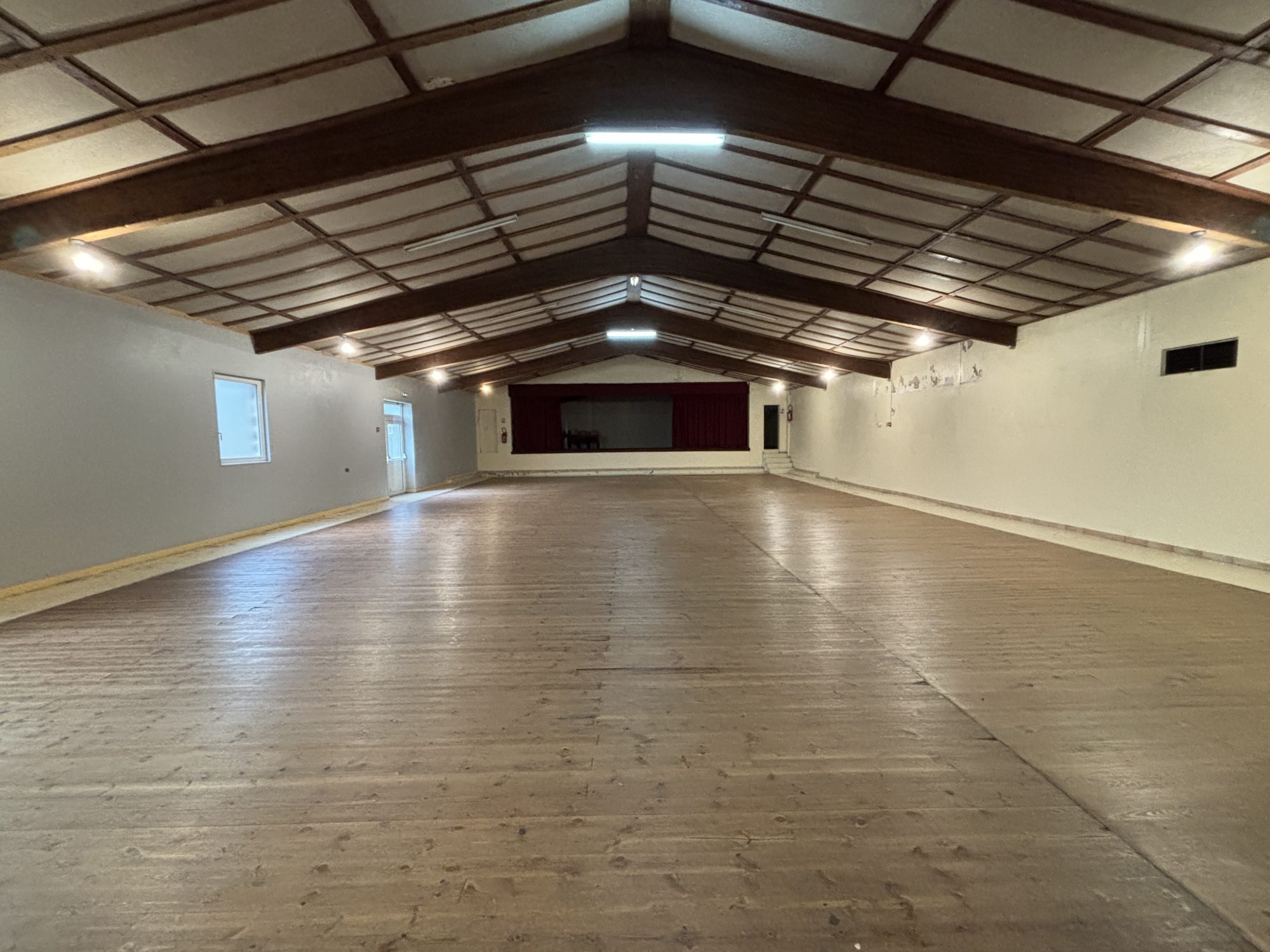 - Rez-de-Chaussée : hall d’entrée, grande salle, scène, arrière scène, cuisine, bar, sanitaires, arrière-salle, différentes pièces technique.