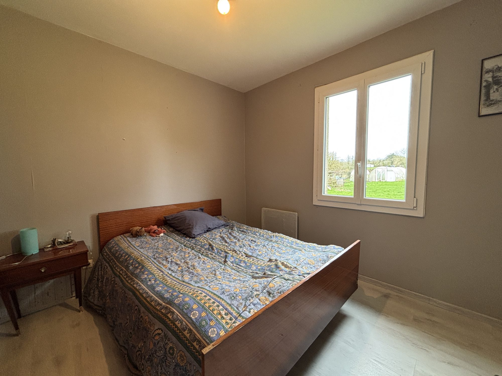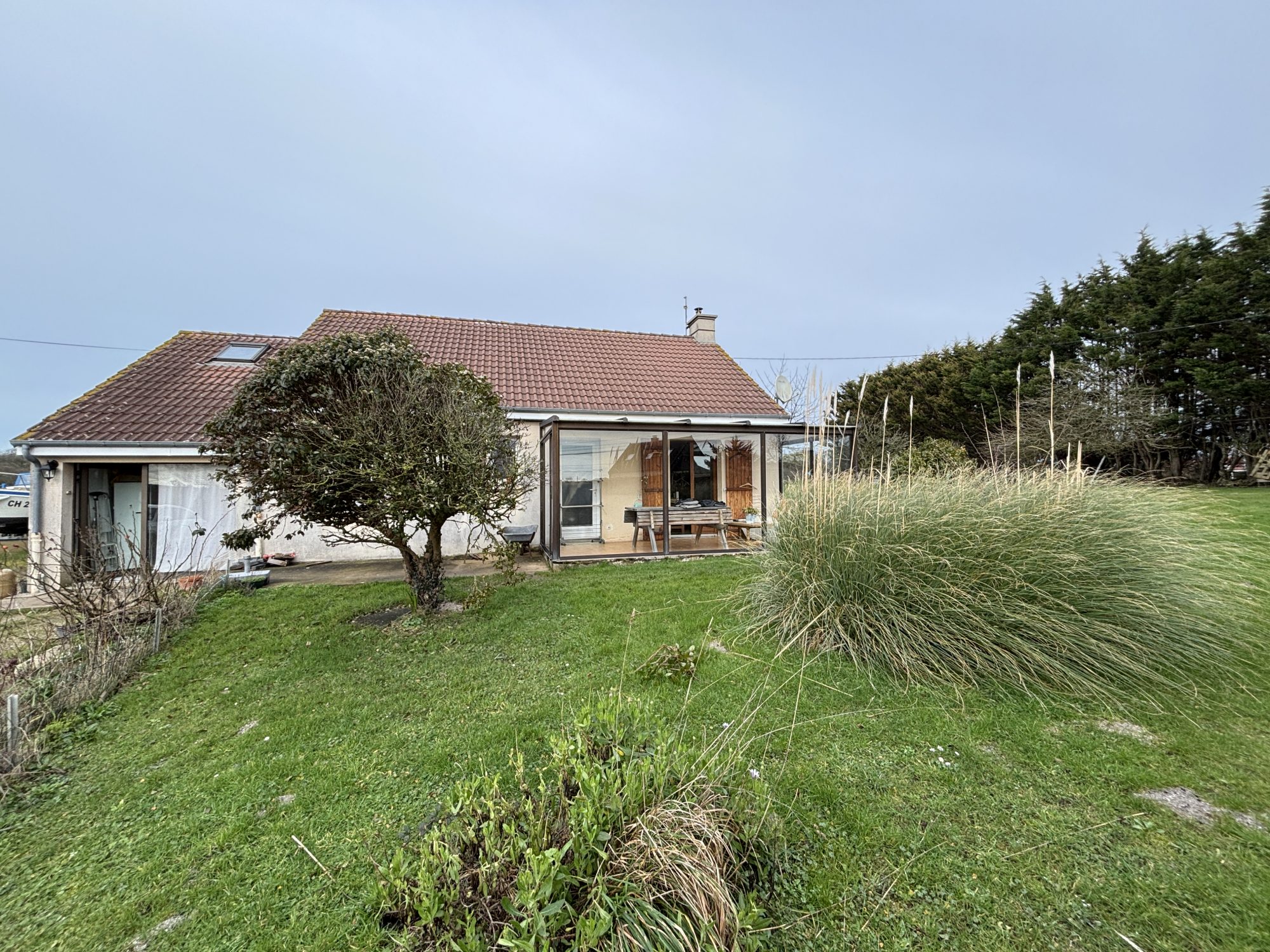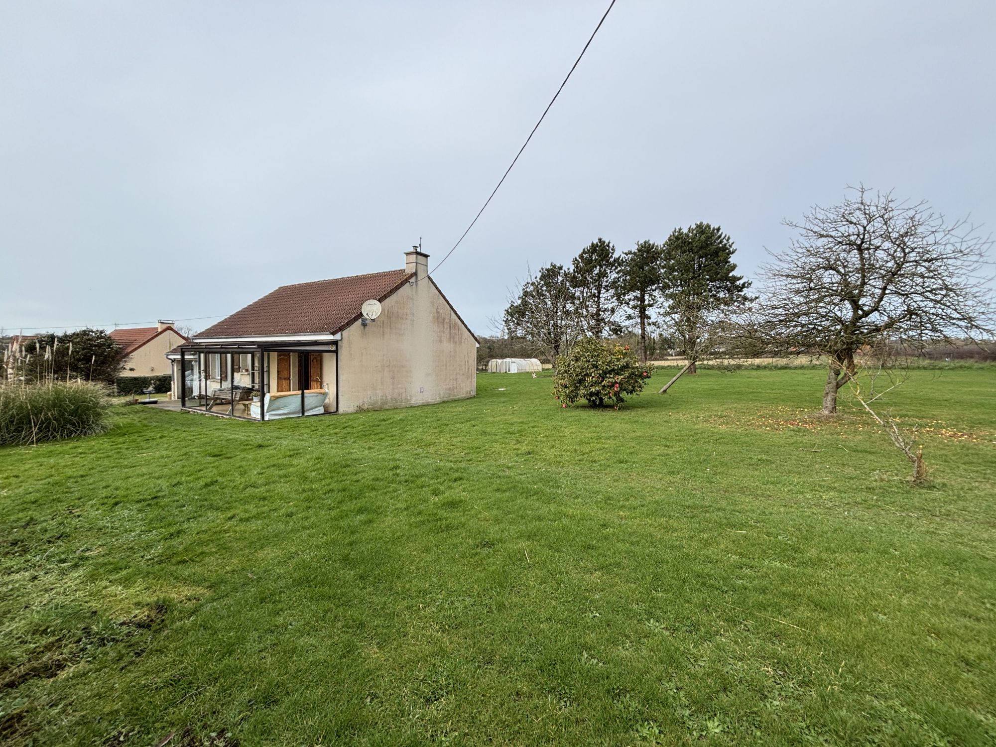 Sur un terrain de 3008 m², maison de plain-pied (louée) comprenant : - Véranda, séjour/salon avec insert à bois, cuisine, couloir, salle de bains, wc et deux chambres. Garage attenant et jardin autour. Chauffage électrique, huisseries bois et pvc. Assainissement à mettre aux normes.